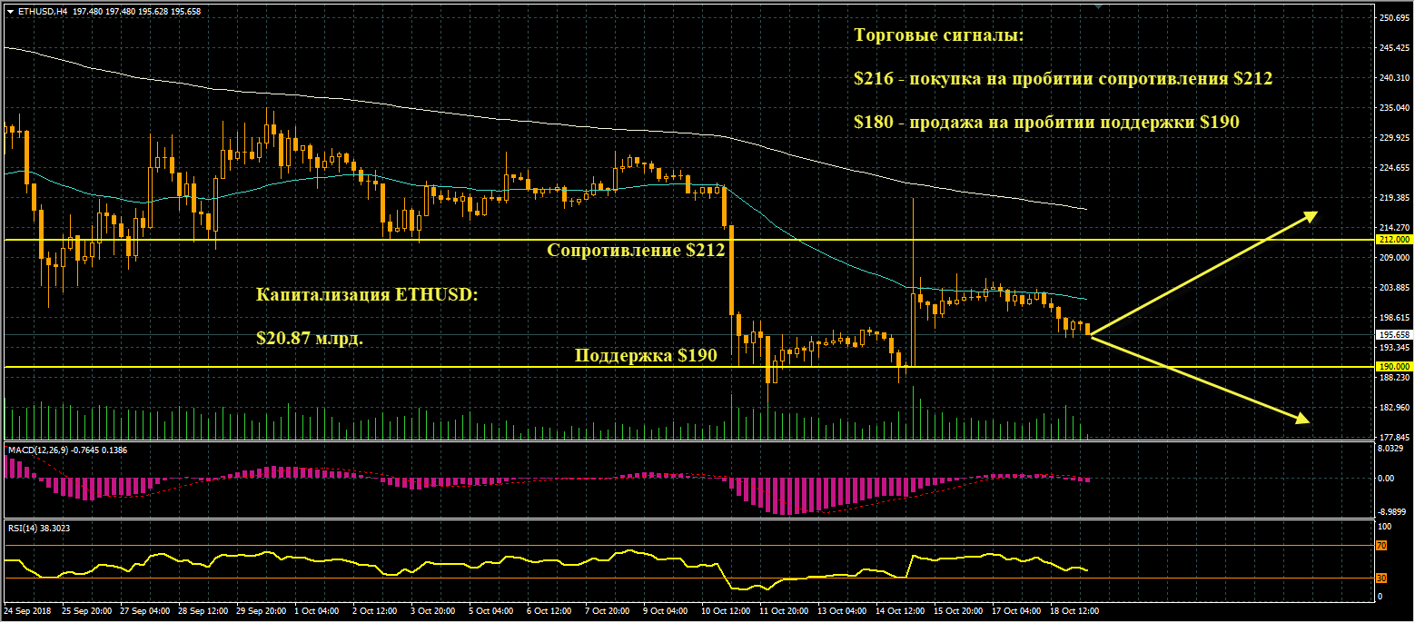 ETHUSD: Эфириум движется в узком боковике, технические индикаторы не подают новых сигналов. Поэтому оставляем прогноз прежним. В длинные позиции заходим после пробития сопротивления $212, начиная с отметки $216. В шорты заходим, если Эфир пробьет поддержку $190. Продажи в таком случае начинаем с $180.