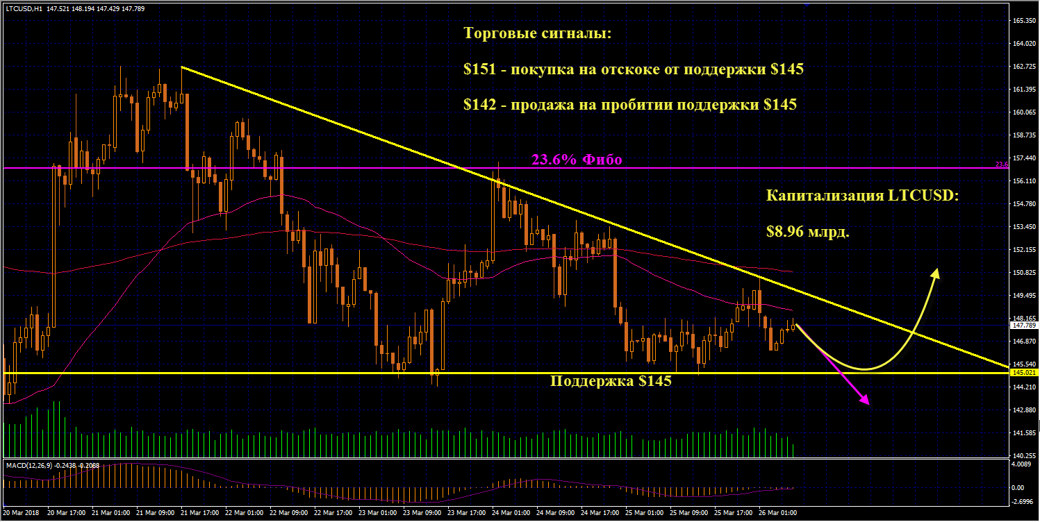 LTCUSD: Лайткоин консолидируется последние 5 часов с медвежьим уклоном после отскока от бывшего сопротивления $155,40. По MACD все ведет к сохранению флэта, по Alligator возможен рост в сторону $182,9 сопротивления. Покупать с текущих уровней не планируем, так как медвежью коррекцию исключать не стоит. Если это случиться, то будем открывать длинные позиции на отскоках от $137,20 и $127,50 с $140,40 и $131 соответственно. На коротких таймфреймах ожидается флэт, по D1 – медвежья динамика.