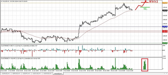 Золото протестировала новый уровень поддержки 1297.00, после чего возобновила свой рост. Более того, крупный объем сосредоточен в данной отметке, что только усиливает его значение и силу. Также стоит отметить, что восходящее движение было резким и уверенным. Учитывая все эти факторы, а также предыдущий стремительный рост цены, нам стоит рассматривать исключительно длинные позиции по данному инструменту.