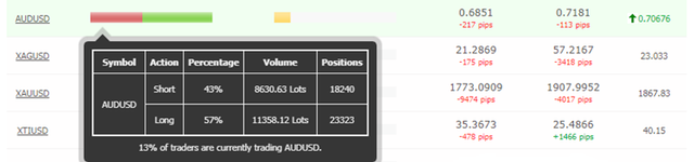 Что касается сентимента рынка, то данный технический индикатор полностью подтверждает наш торговый сценарий открытия коротких позиций по австралийскому доллару, так как большинство розничных трейдеров находится в длинных позициях (торговля против «толпы»).