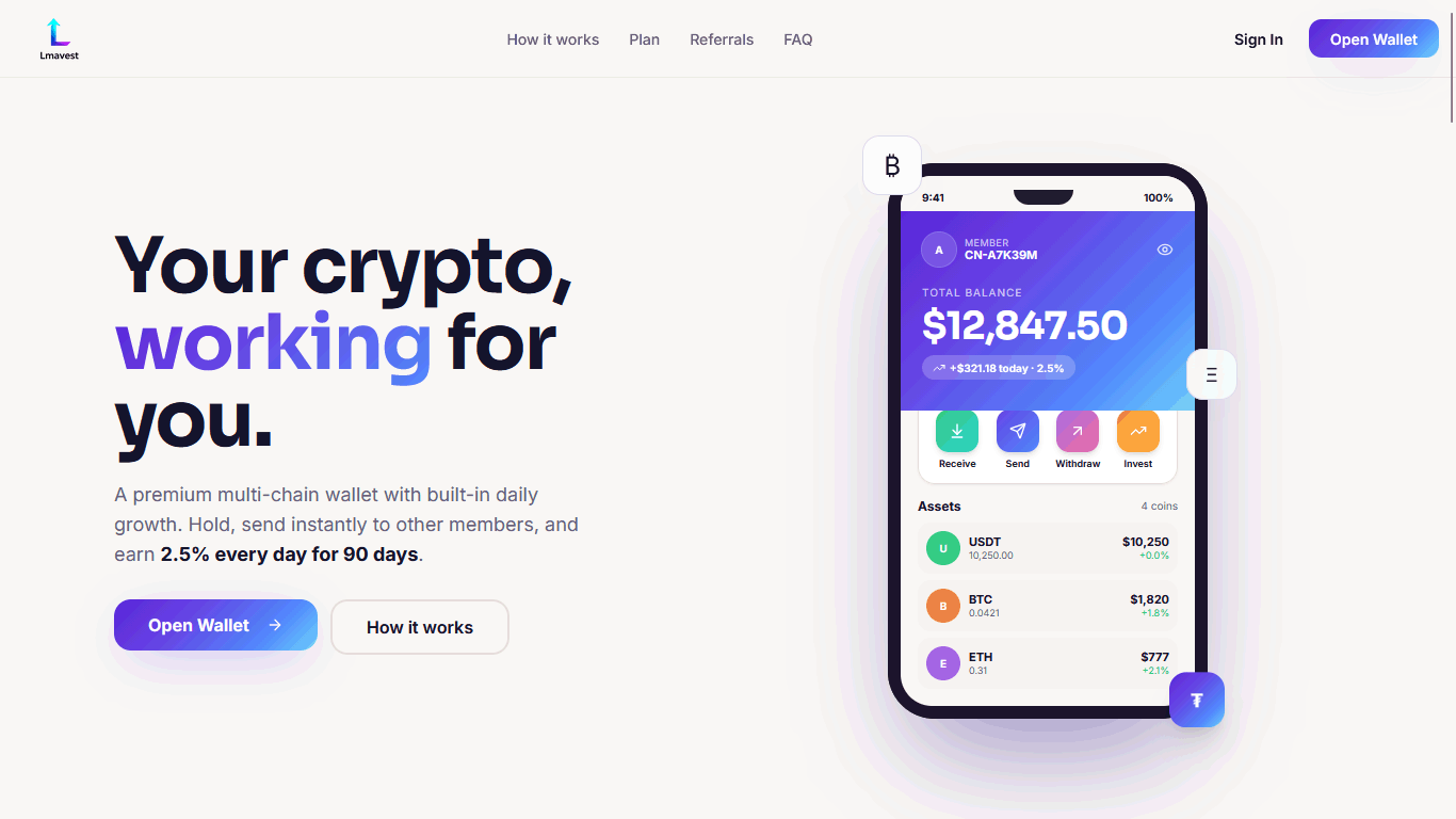 Ваша криптовалюта, работающая на вас. Премиальный мультисетевой кошелек со встроенным ежедневным ростом. Храните, мгновенно отправляйте другим участникам и зарабатывайте 2,5% каждый день в течение 90 дней.