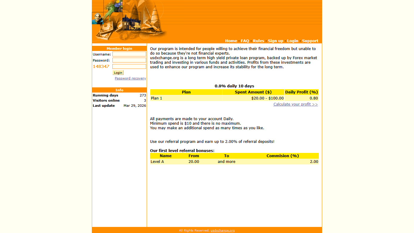 usdxchange.org — это долгосрочная программа частного кредитования с высокой доходностью, подкрепленная торговлей на рынке Форекс и инвестициями в различные фонды и виды деятельности. Прибыль от этих инвестиций используется для улучшения нашей программы и повышения ее стабильности в долгосрочной перспективе.